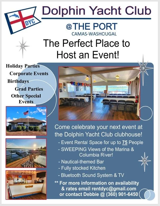 From it's stunning views of the Columbia River to the nautical-themed bar and seating capacity for up to 75-80 guests, the DYC Clubhouse is available for birthday parties, celebrations, family reunions, and corporate parties or other special events. Please see flyer for details and contact information.